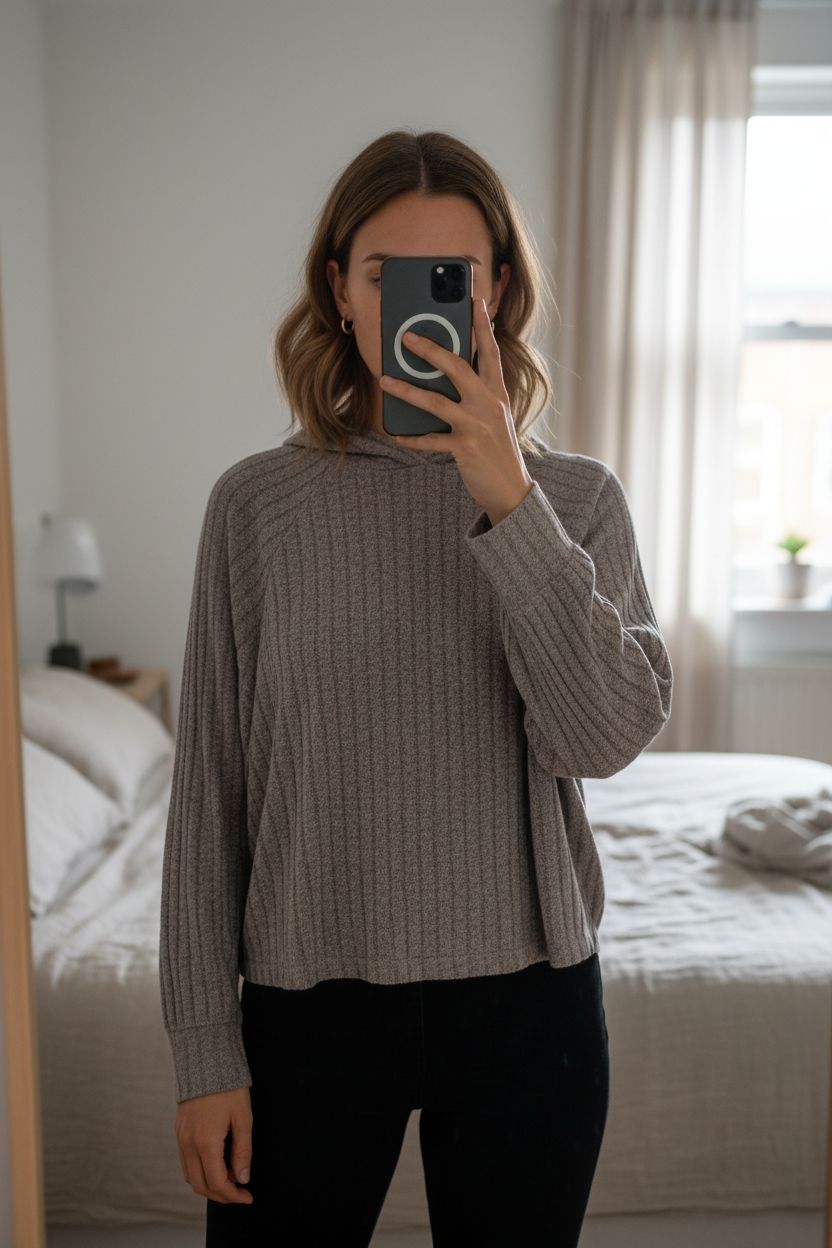 Eine Person in Ultra weicher Pullover mit Kapuze und Rippstruktur | Gr. S aufrecht stehend, der Kamera zugewandt, mit schlanker Figur, in einem sanft beleuchteten Schlafzimmer, mit natürlichem Licht, das durch ein Fenster fällt.