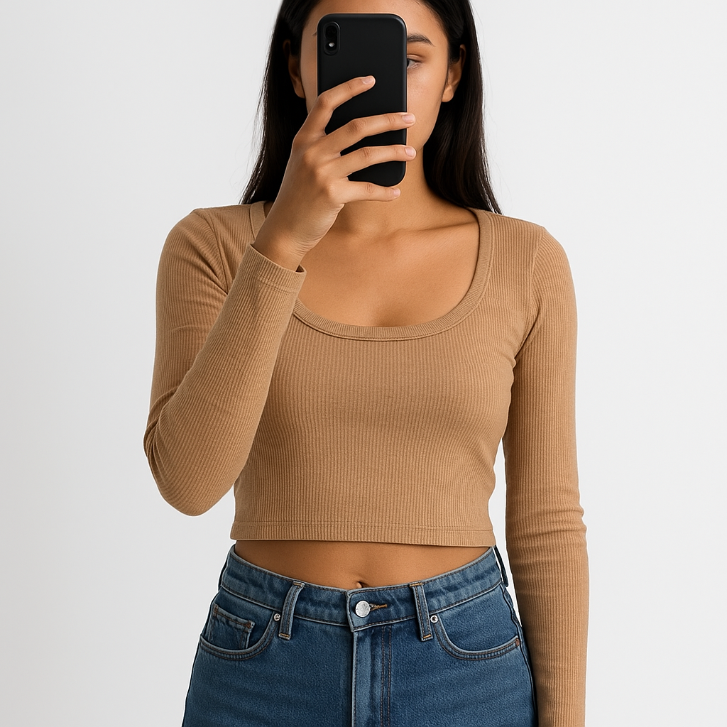Une personne en un haut court (crop top) côtelé beige/camel à manches longues de la marque SHEIN. debout, face à la caméra, dans un studio photo épuré avec fond blanc et éclairage doux.