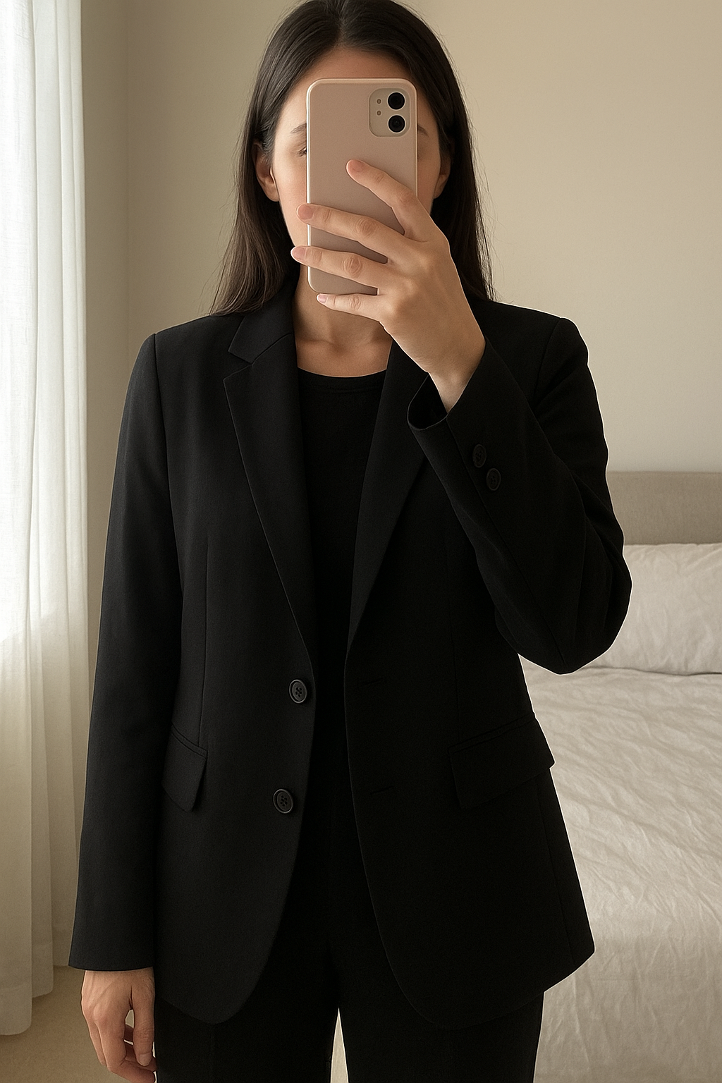 Uniqlo Black Blazer - UK Size 10 standing straight facing the camera, in a softly lit bedroom setting, with gentle natural light filtering through a window.