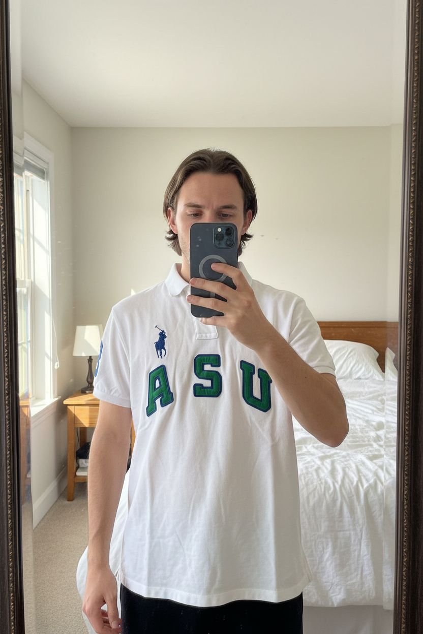 USA Ralph Lauren Polo Hemd / T-Shirt aufrecht stehend, der Kamera zugewandt, in einem sanft beleuchteten Schlafzimmer, mit natürlichem Licht, das durch ein Fenster fällt.