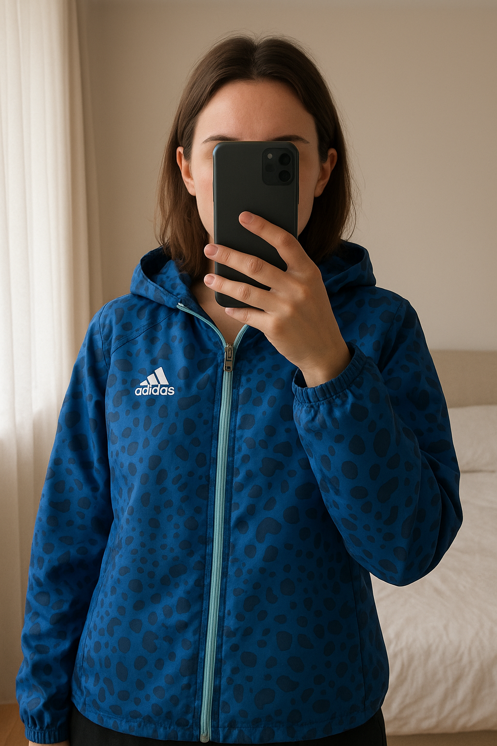 Veste Adidas debout, face à la caméra, dans une chambre à la lumière douce, avec une lumière naturelle filtrant par la fenêtre.