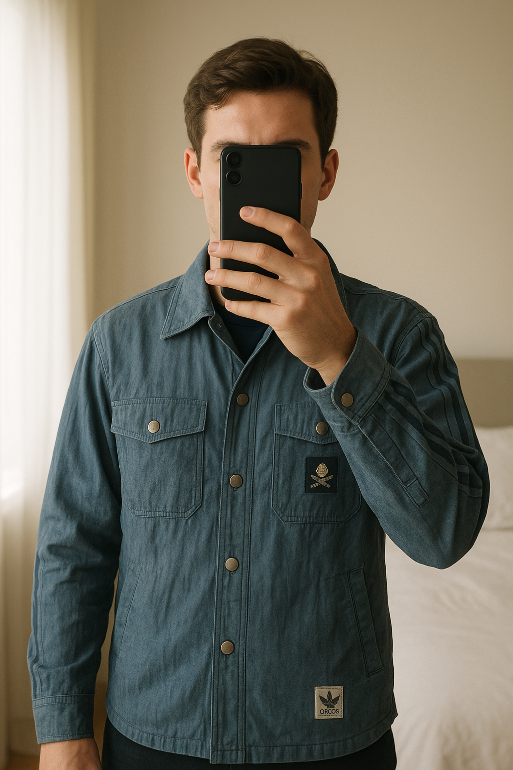 Veste adidas x neighborhood debout, face à la caméra, dans une chambre à la lumière douce, avec une lumière naturelle filtrant par la fenêtre.