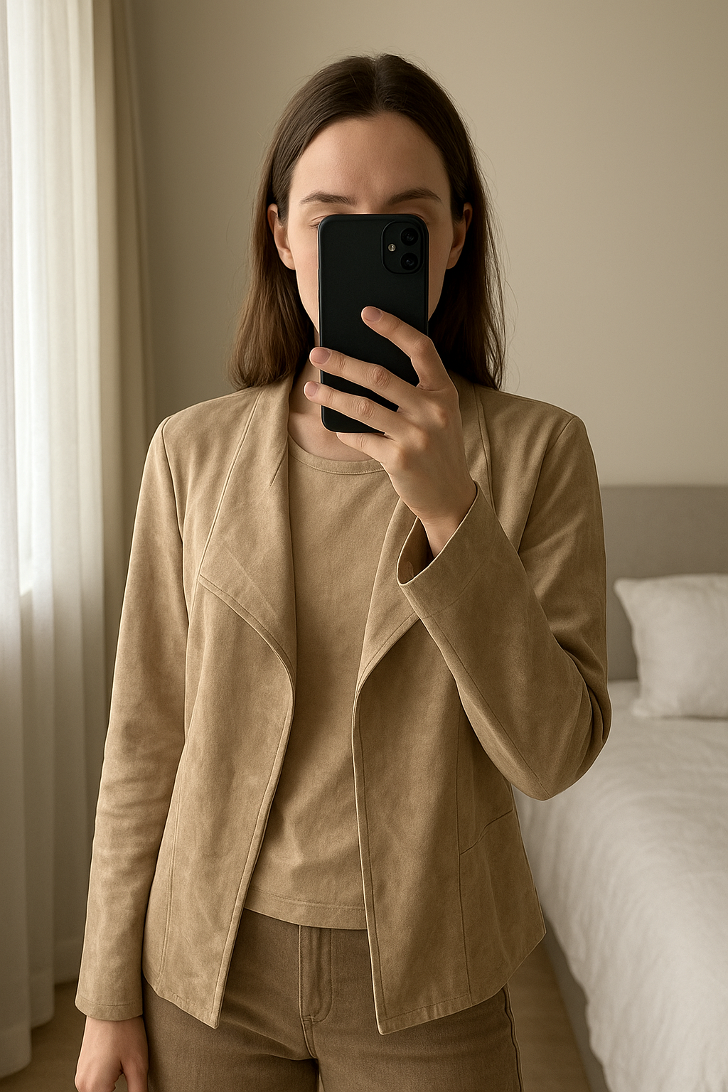 Veste breal debout, face à la caméra, dans une chambre à la lumière douce, avec une lumière naturelle filtrant par la fenêtre.