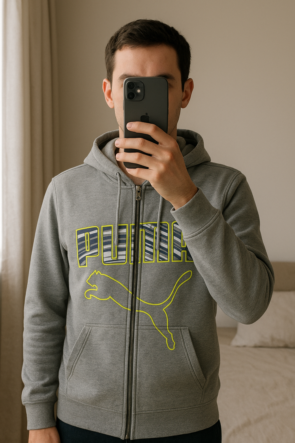 Veste à capuche PUMA grise zippée - Taille M debout, face à la caméra, dans une chambre à la lumière douce, avec une lumière naturelle filtrant par la fenêtre.