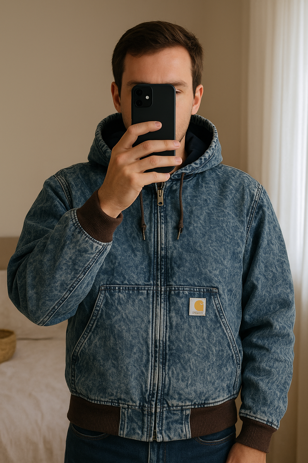 Veste à capuche style carhartt rework taille XL debout, face à la caméra, dans une chambre à la lumière douce, avec une lumière naturelle filtrant par la fenêtre.