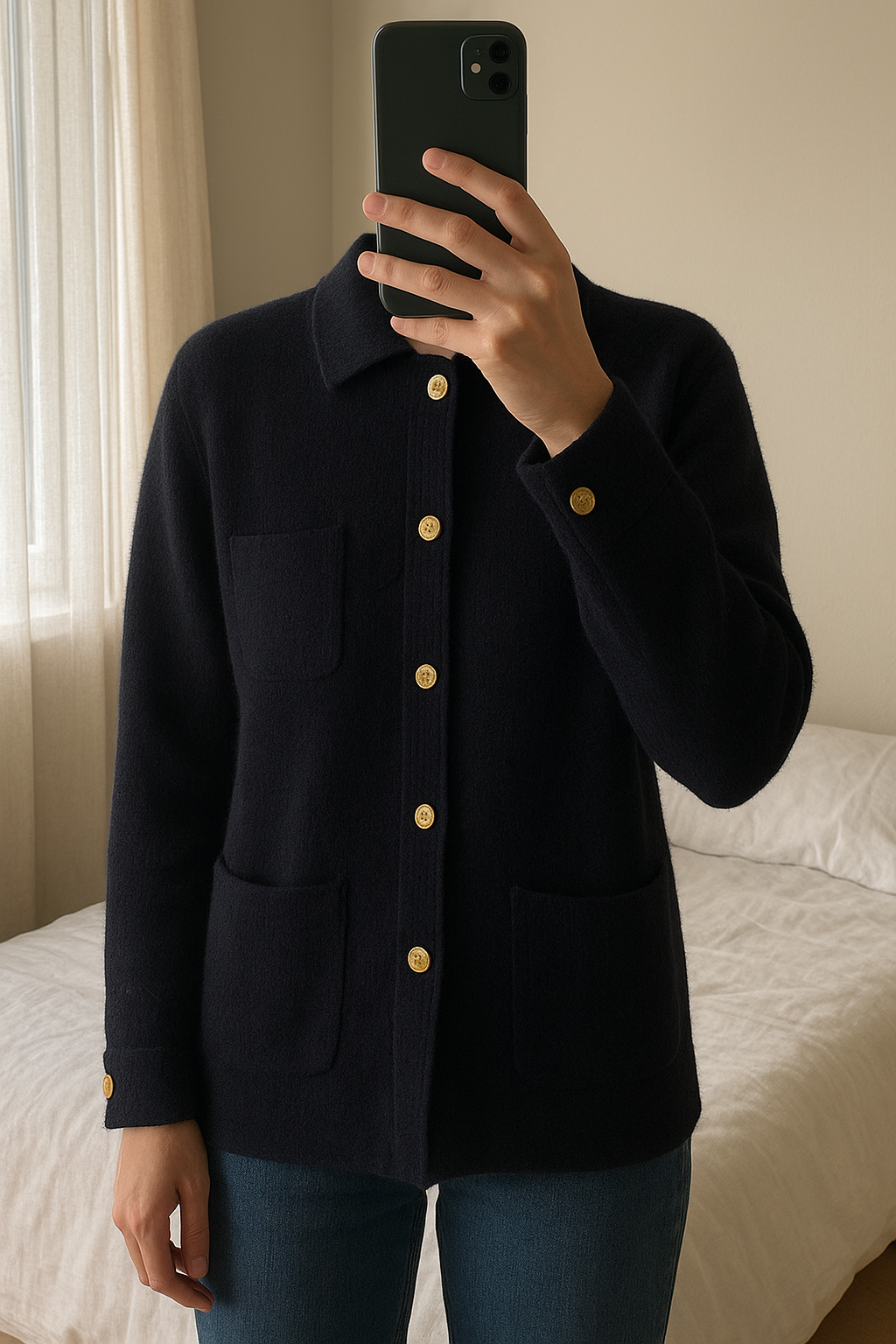 Veste cardigan en laine noire boutons dorés debout, face à la caméra, dans une chambre à la lumière douce, avec une lumière naturelle filtrant par la fenêtre.