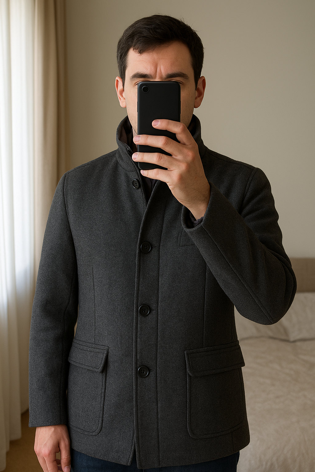 Veste Celio homme - Taille L debout, face à la caméra, dans une chambre à la lumière douce, avec une lumière naturelle filtrant par la fenêtre.