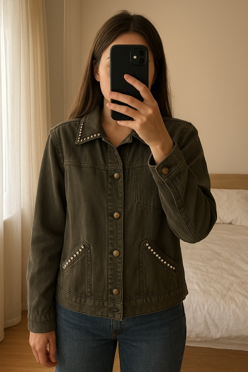 Veste chemise en jean Zara debout, face à la caméra, dans une chambre à la lumière douce, avec une lumière naturelle filtrant par la fenêtre.