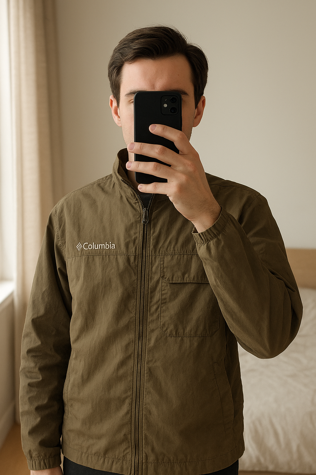 Veste Columbia vintage / Kaki / M debout, face à la caméra, dans une chambre à la lumière douce, avec une lumière naturelle filtrant par la fenêtre.