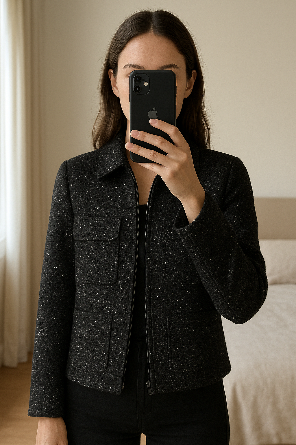 Veste courte debout, face à la caméra, dans une chambre à la lumière douce, avec une lumière naturelle filtrant par la fenêtre.