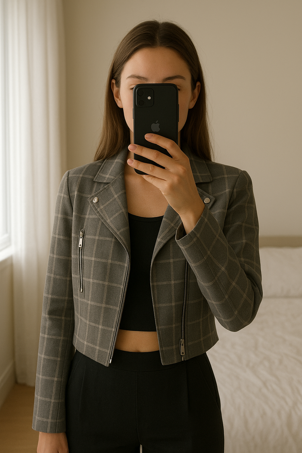 Veste courte Kookaï debout, face à la caméra, dans une chambre à la lumière douce, avec une lumière naturelle filtrant par la fenêtre.