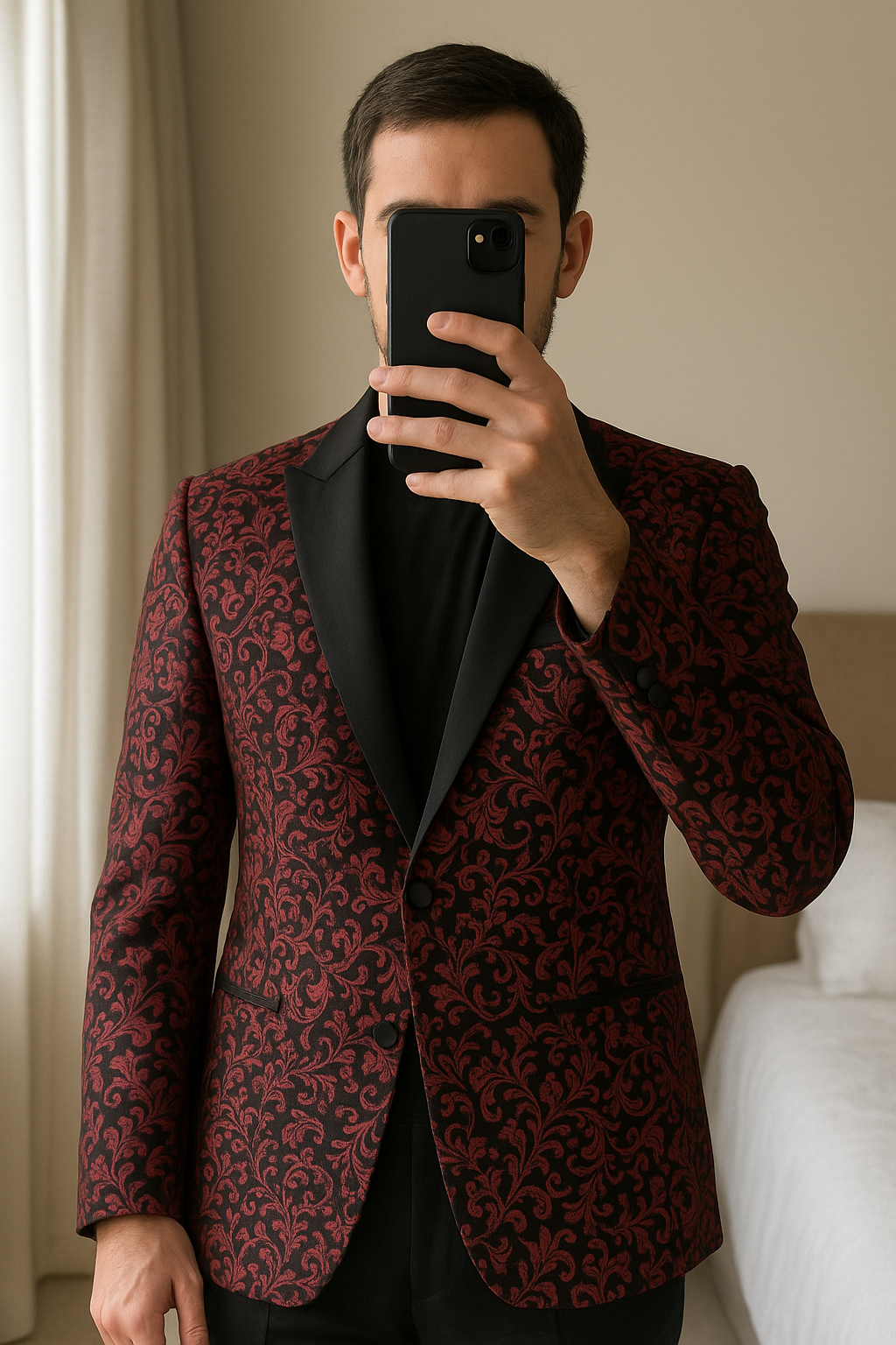 Veste de costume debout, face à la caméra, dans une chambre à la lumière douce, avec une lumière naturelle filtrant par la fenêtre.