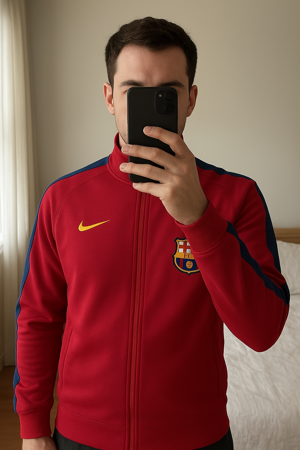 veste de survêtement Barcelone nike debout, face à la caméra, dans une chambre à la lumière douce, avec une lumière naturelle filtrant par la fenêtre.