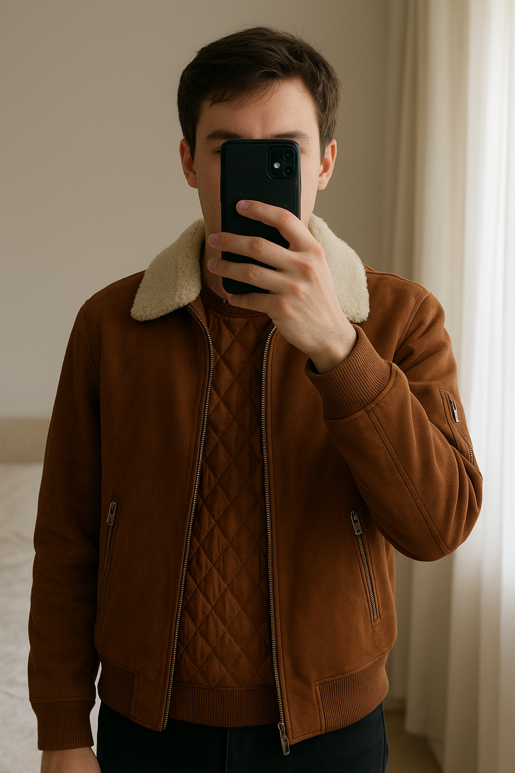 Veste en daim Frilivin debout, face à la caméra, dans une chambre à la lumière douce, avec une lumière naturelle filtrant par la fenêtre.
