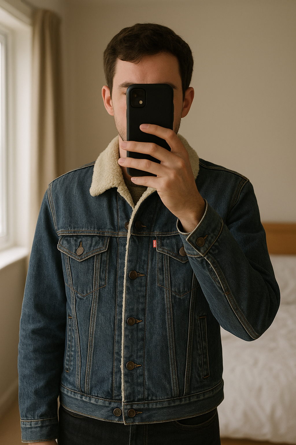 Veste en jean Levi’s bleu marine debout, face à la caméra, dans une chambre à la lumière douce, avec une lumière naturelle filtrant par la fenêtre.