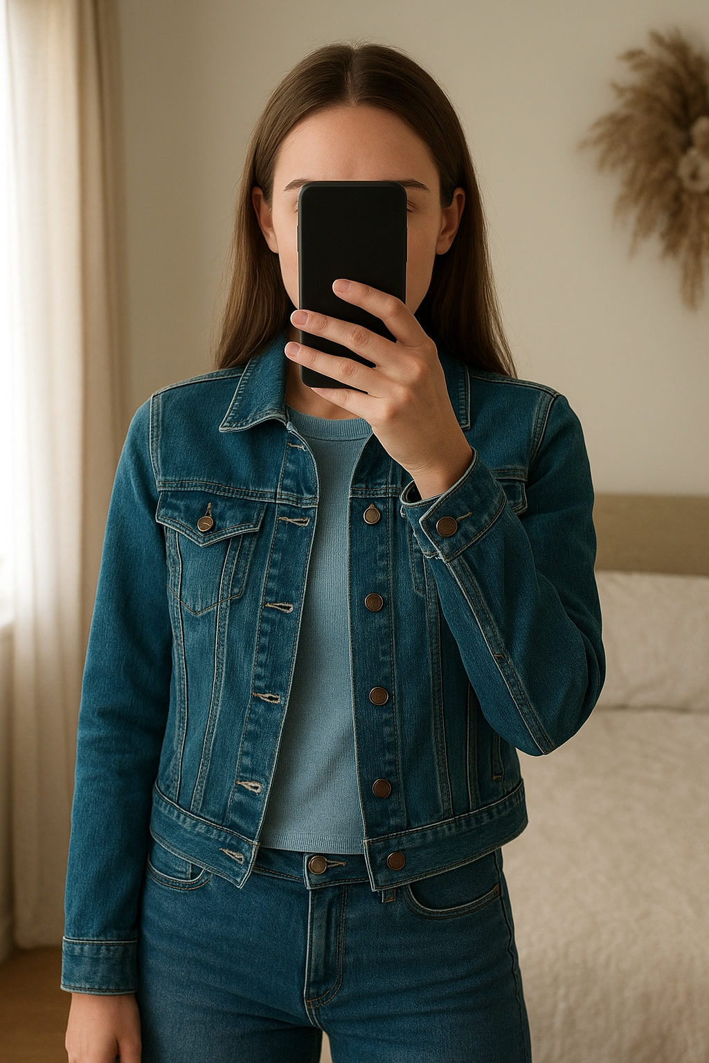 Veste en jeans debout, face à la caméra, dans une chambre à la lumière douce, avec une lumière naturelle filtrant par la fenêtre.