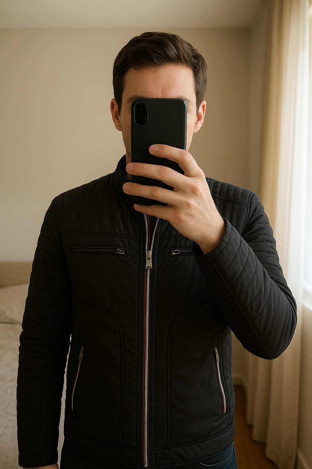 Veste Fusalp PARKE (collection hiver 2018)homme noire taille 50 – neuve sans étiquette debout, face à la caméra, dans une chambre à la lumière douce, avec une lumière naturelle filtrant par la fenêtre.