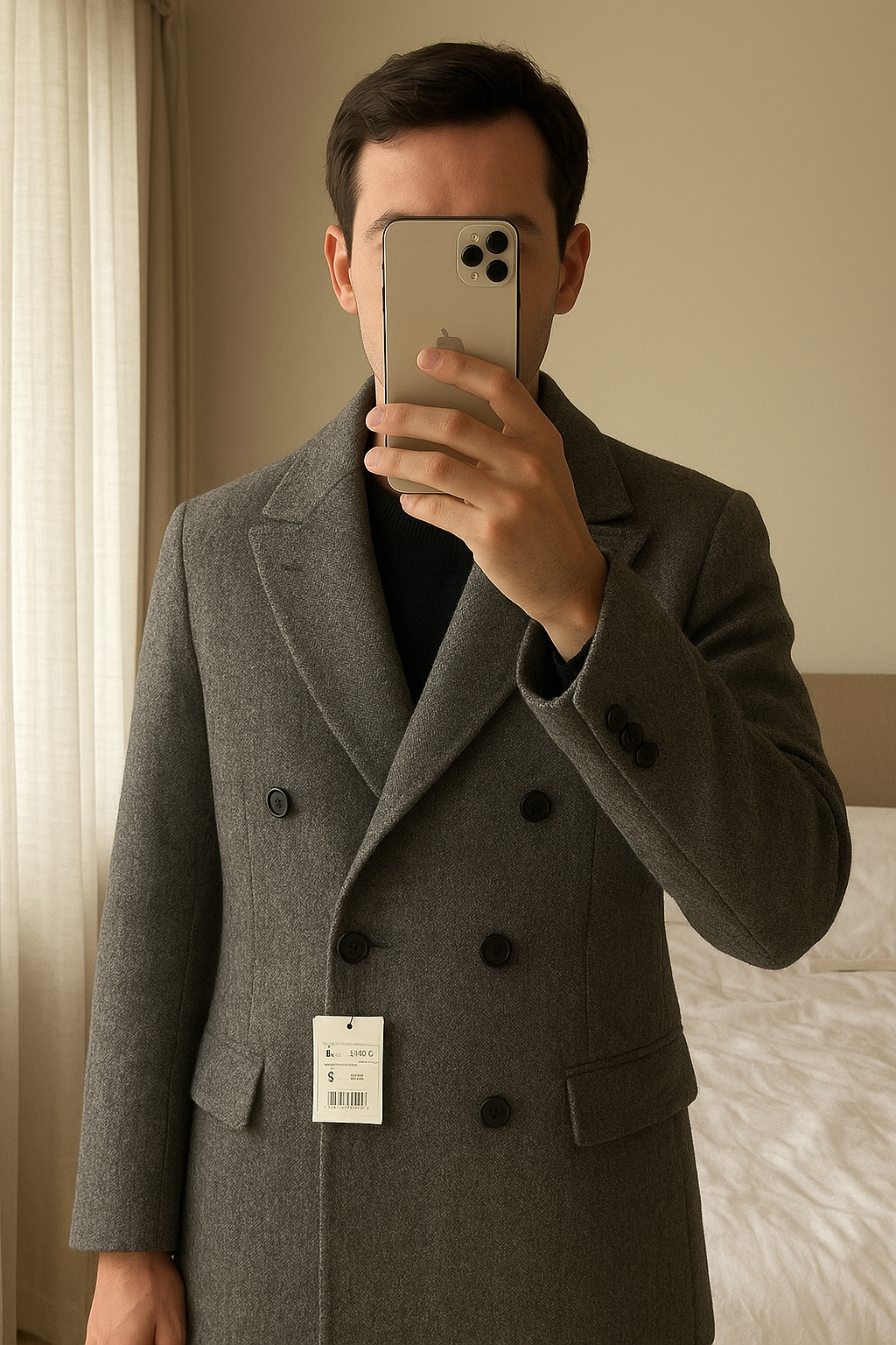Veste homme debout, face à la caméra, dans une chambre à la lumière douce, avec une lumière naturelle filtrant par la fenêtre.