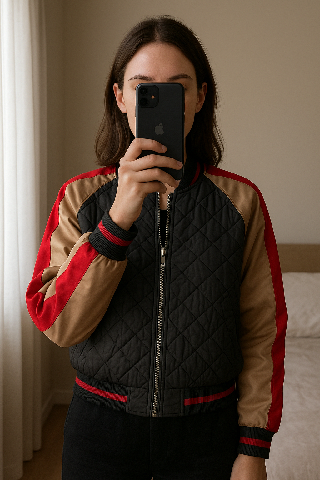 Veste JCL – bomber satin & matelassé – Femme taille M – Noir / Beige / Rouge – Très bon état debout, face à la caméra, dans une chambre à la lumière douce, avec une lumière naturelle filtrant par la fenêtre.