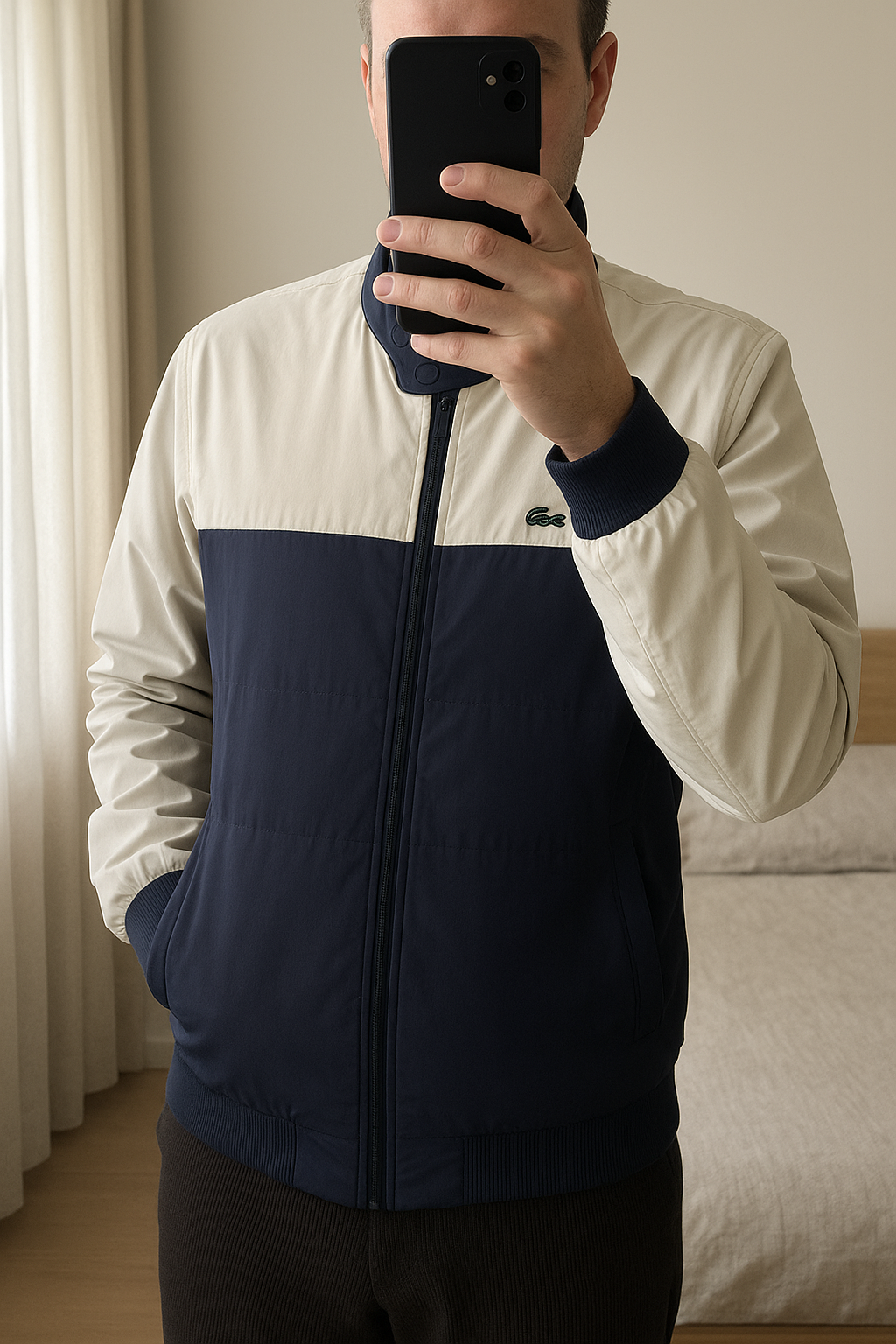 Veste Lacoste homme debout, face à la caméra, dans une chambre à la lumière douce, avec une lumière naturelle filtrant par la fenêtre.