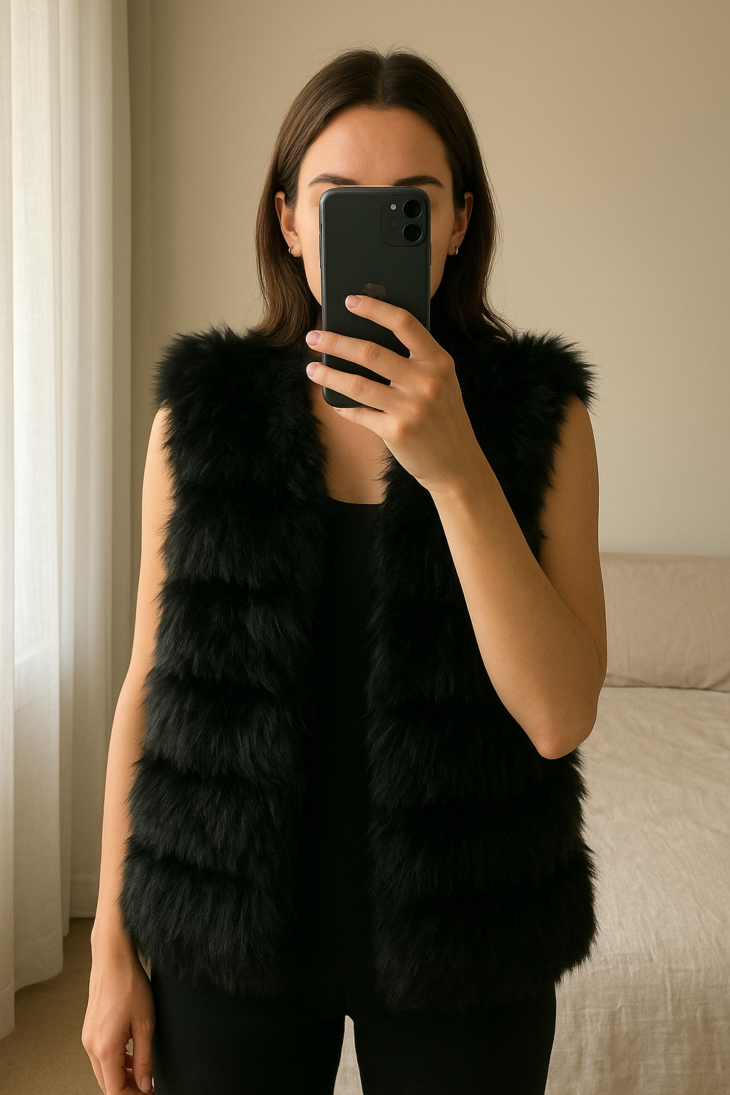 Veste longue sans manche debout, face à la caméra, dans une chambre à la lumière douce, avec une lumière naturelle filtrant par la fenêtre.