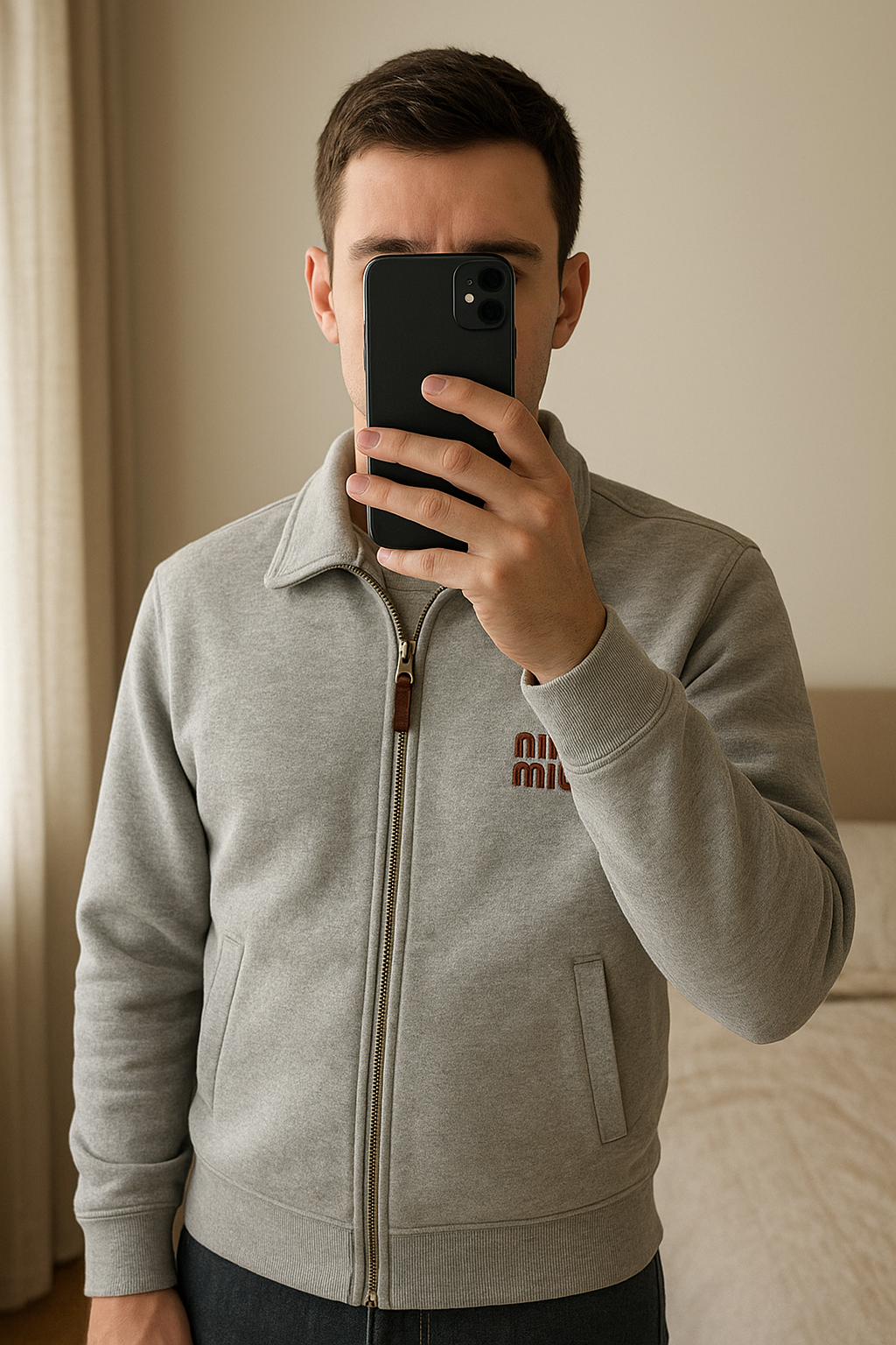 Veste Miumiu gillet sweat zip grise coton M debout, face à la caméra, dans une chambre à la lumière douce, avec une lumière naturelle filtrant par la fenêtre.