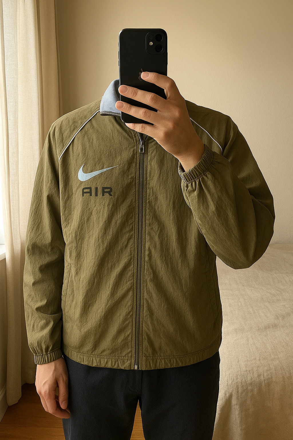 Veste nike debout, face à la caméra, dans une chambre à la lumière douce, avec une lumière naturelle filtrant par la fenêtre.