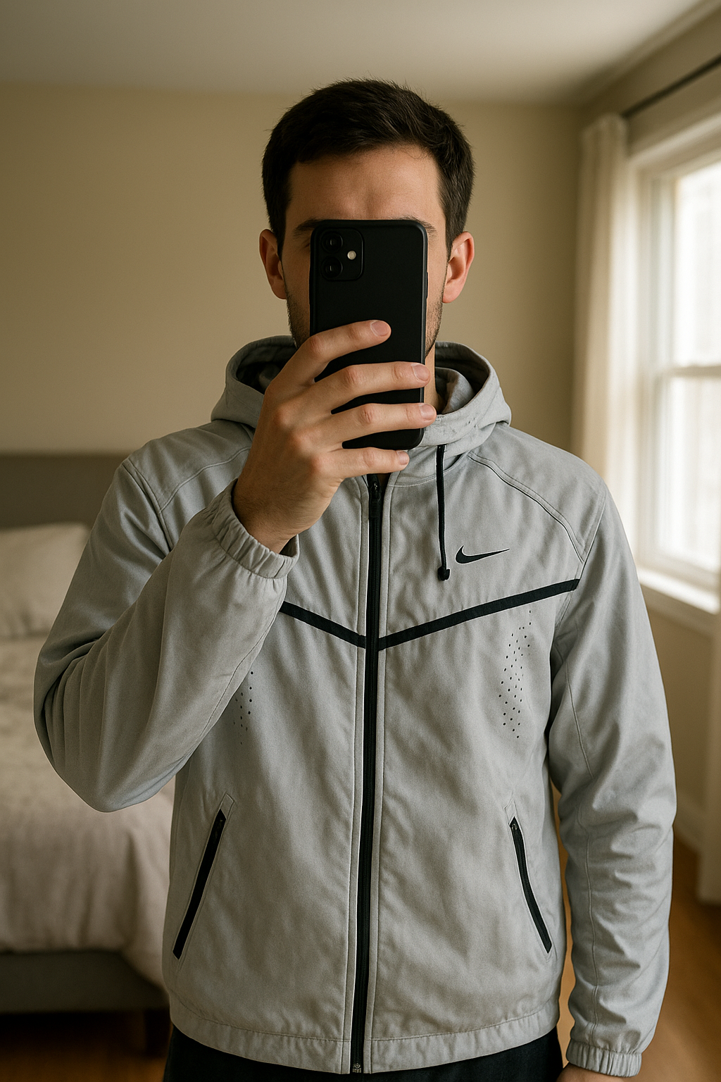 Veste nike ultra rare réfléchissante flash usa football soccer debout, face à la caméra, dans une chambre à la lumière douce, avec une lumière naturelle filtrant par la fenêtre.