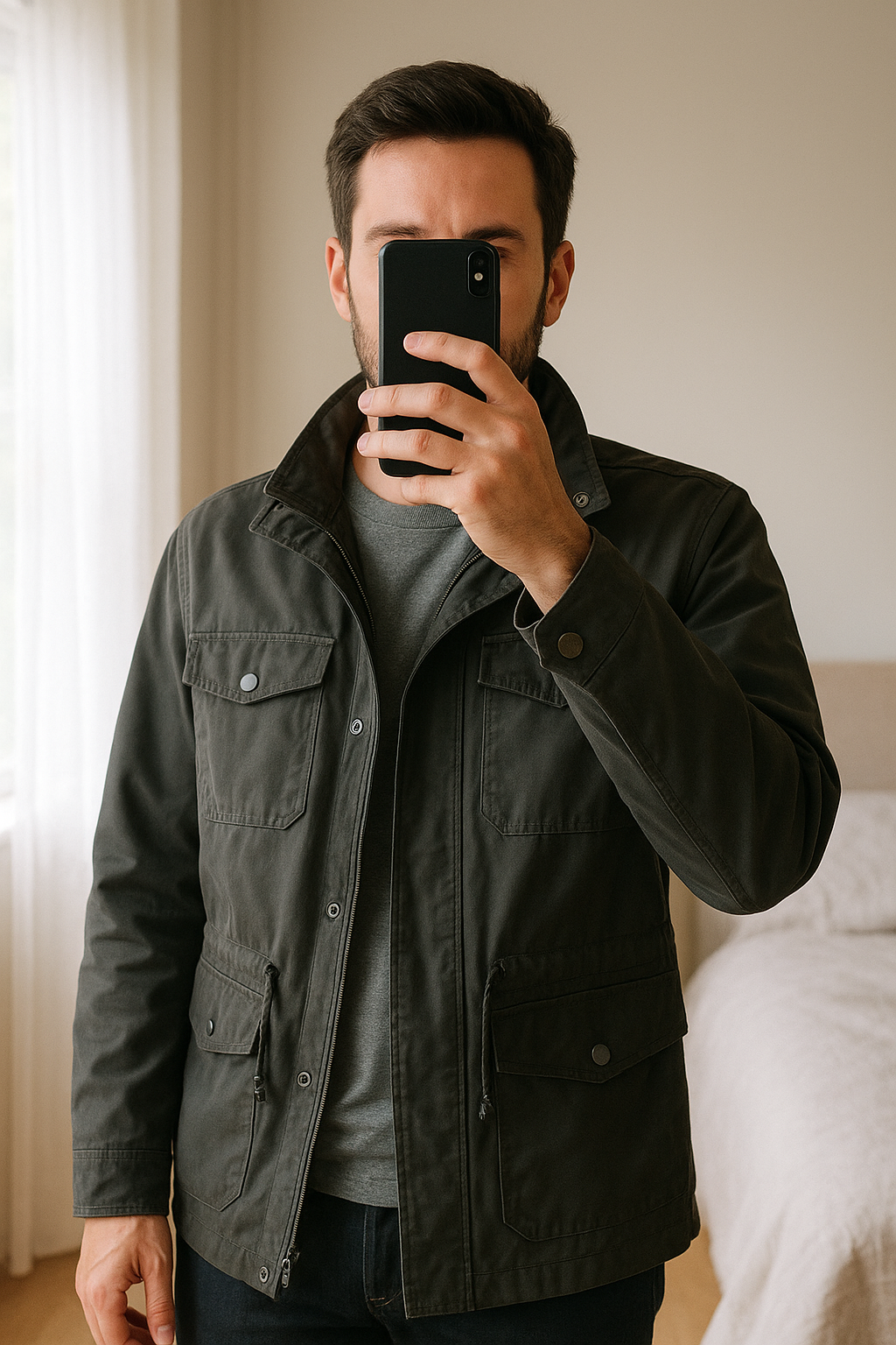 Veste noire homme debout, face à la caméra, dans une chambre à la lumière douce, avec une lumière naturelle filtrant par la fenêtre.