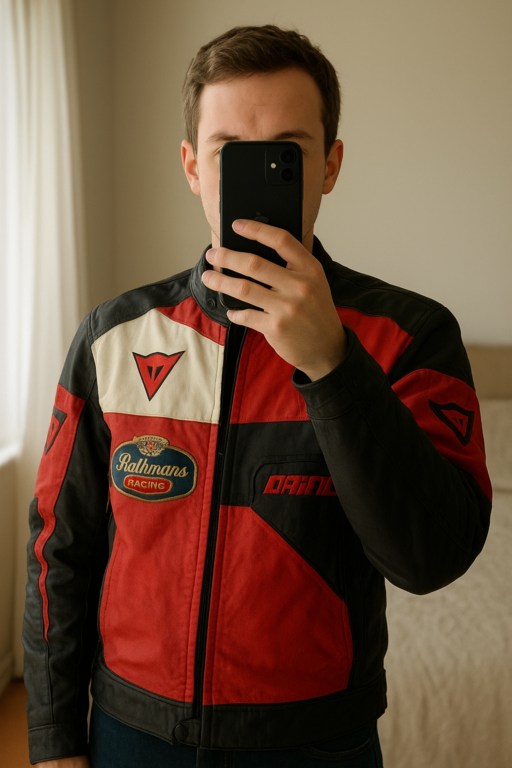 Veste épaisse Dainese debout, face à la caméra, dans une chambre à la lumière douce, avec une lumière naturelle filtrant par la fenêtre.