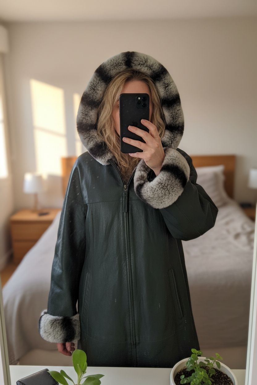 Veste parka réversible verte fourrure – aspect cuir qualité – taille XL debout, face à la caméra, dans une chambre à la lumière douce, avec une lumière naturelle filtrant par la fenêtre.