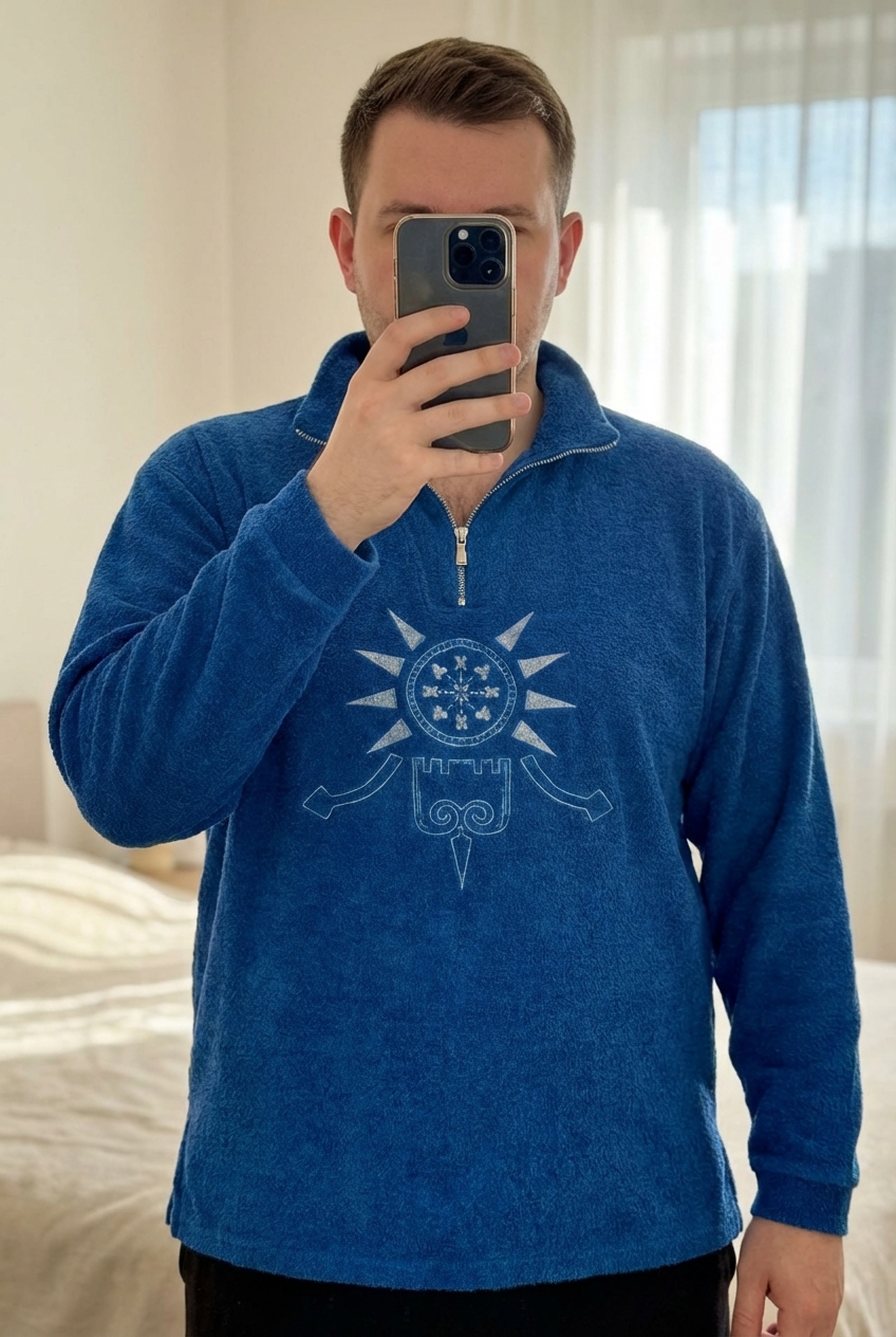 Une personne en Veste Polaire Crazy Fleece Vintage Y2K Norway patern Bleu XL debout, face à la caméra, avec une silhouette légèrement plus ronde, dans une chambre à la lumière douce, avec une lumière naturelle filtrant par la fenêtre.