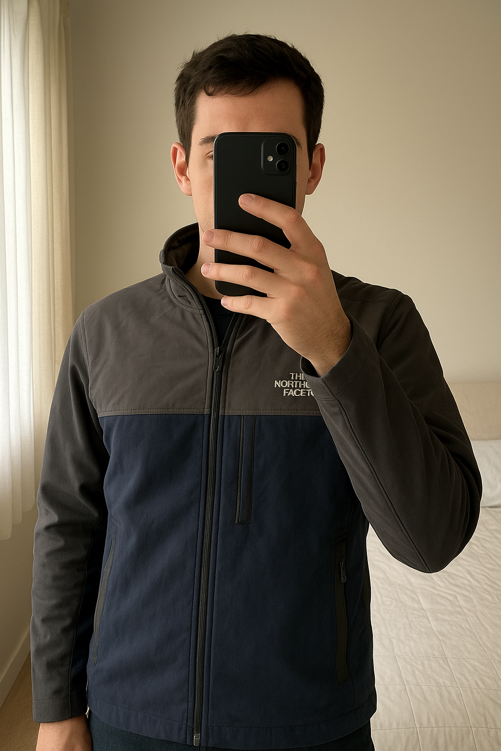 Veste polaire jacket vintage zippé the north face debout, face à la caméra, dans une chambre à la lumière douce, avec une lumière naturelle filtrant par la fenêtre.