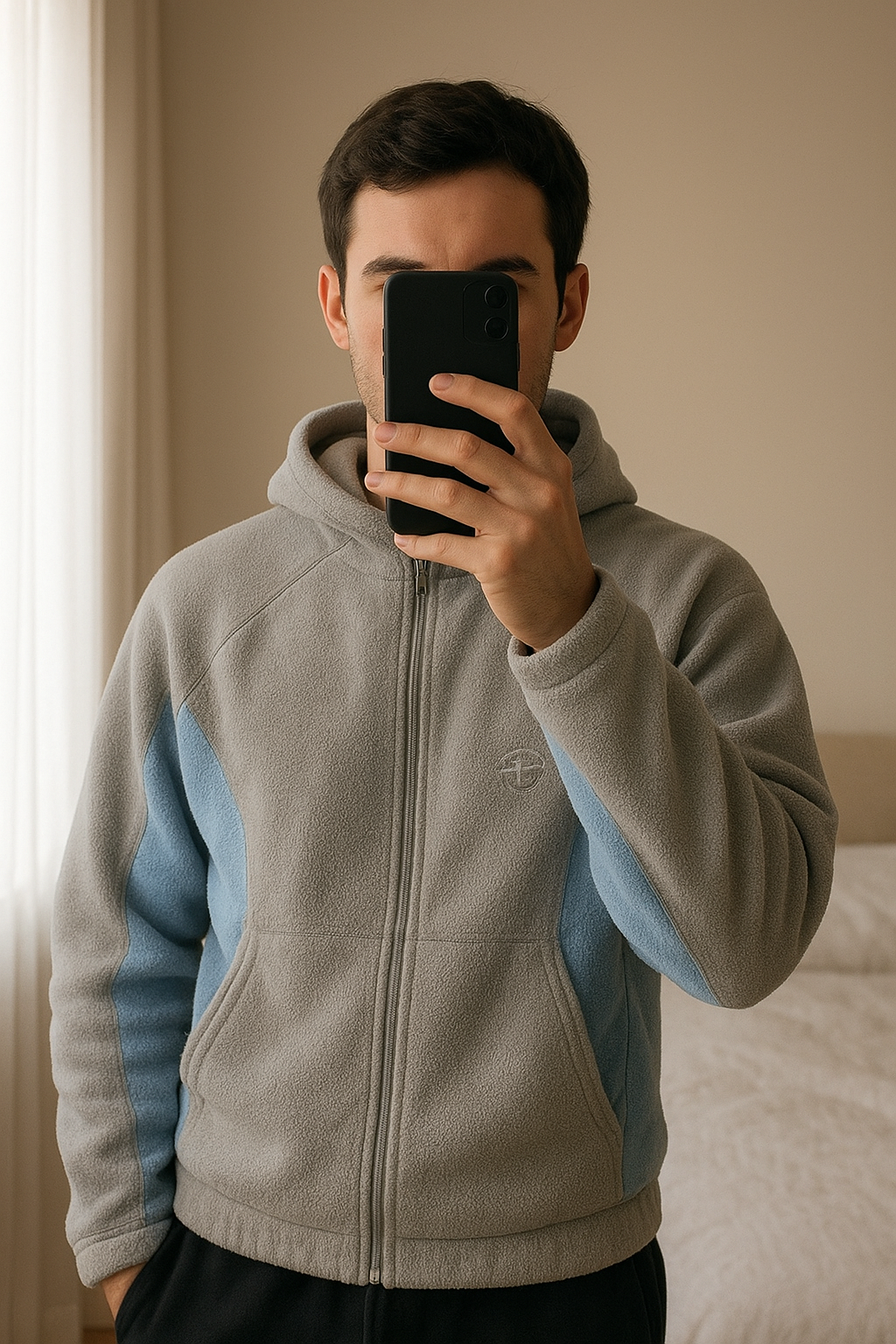 Veste polaire teddy Y2K streetwear vintage USA debout, face à la caméra, dans une chambre à la lumière douce, avec une lumière naturelle filtrant par la fenêtre.
