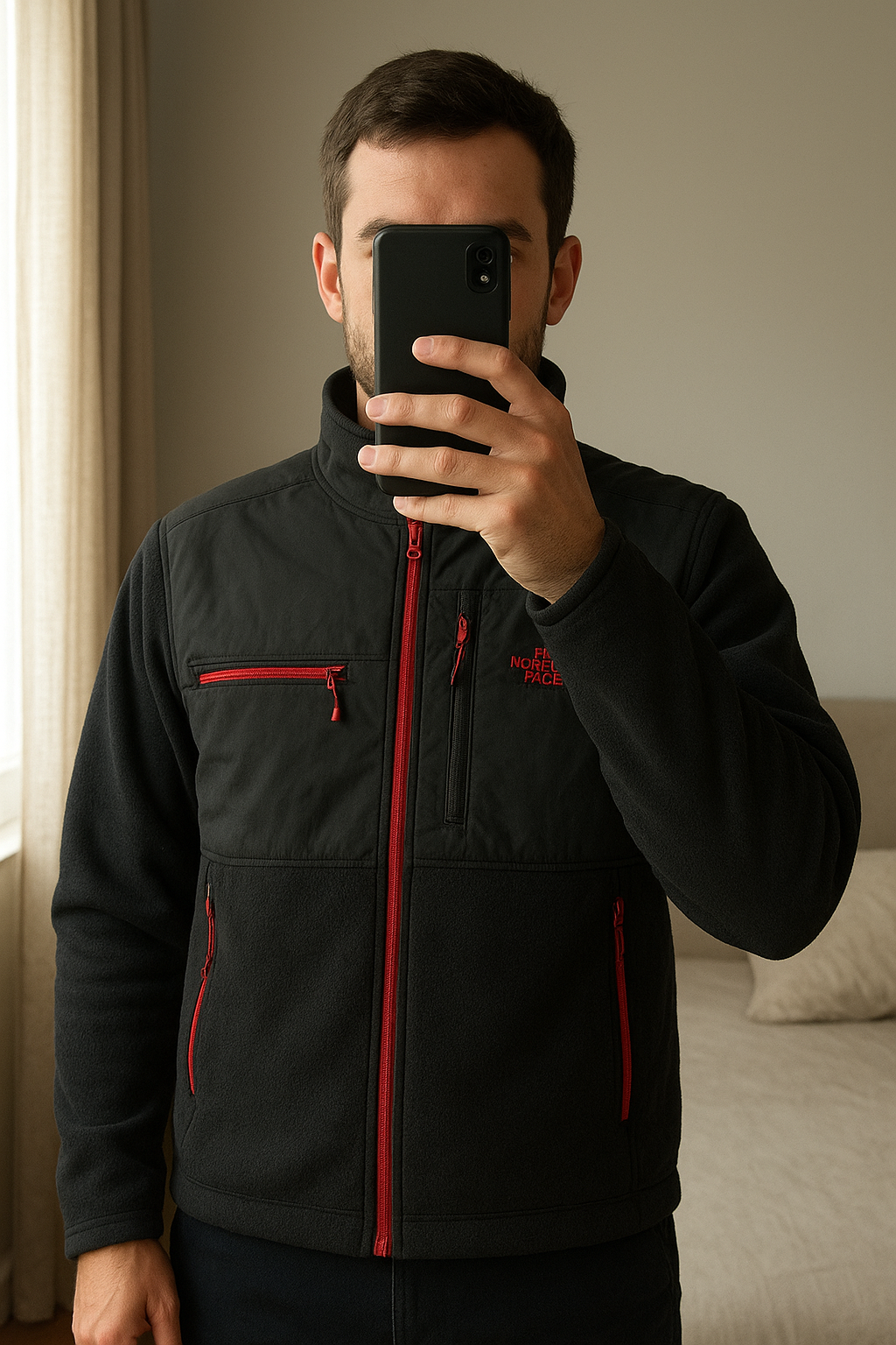 Veste polaire the north face Denali Noir Homme Taille L logo brodé B2015 debout, face à la caméra, dans une chambre à la lumière douce, avec une lumière naturelle filtrant par la fenêtre.