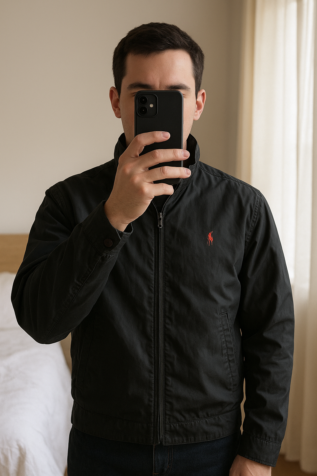 Veste Polo by Ralph Lauren - Taille M (excellent état) debout, face à la caméra, dans une chambre à la lumière douce, avec une lumière naturelle filtrant par la fenêtre.