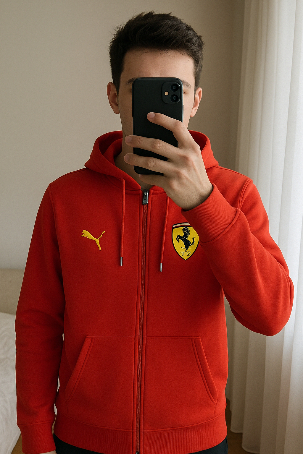 Veste Puma Ferrari debout, face à la caméra, dans une chambre à la lumière douce, avec une lumière naturelle filtrant par la fenêtre.