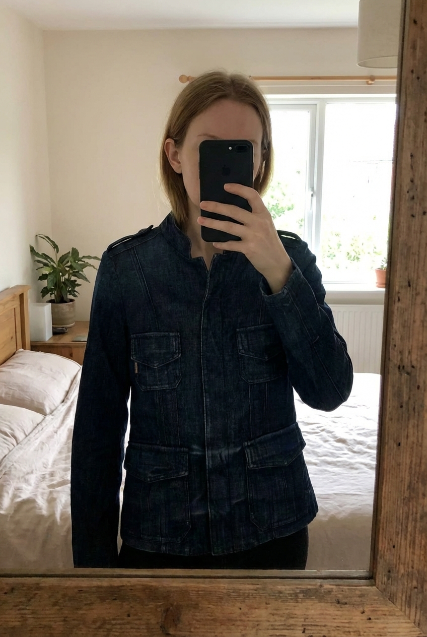 Une personne en Veste RAER en jean debout, face à la caméra, avec une silhouette fine, dans une chambre à la lumière douce, avec une lumière naturelle filtrant par la fenêtre.