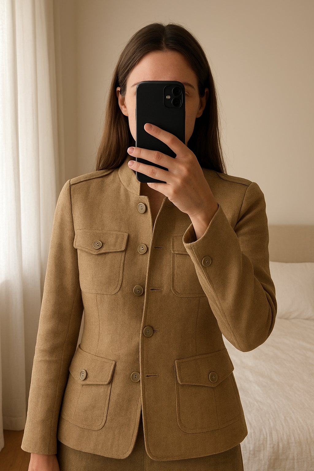 Veste Ralph Lauren debout, face à la caméra, dans une chambre à la lumière douce, avec une lumière naturelle filtrant par la fenêtre.