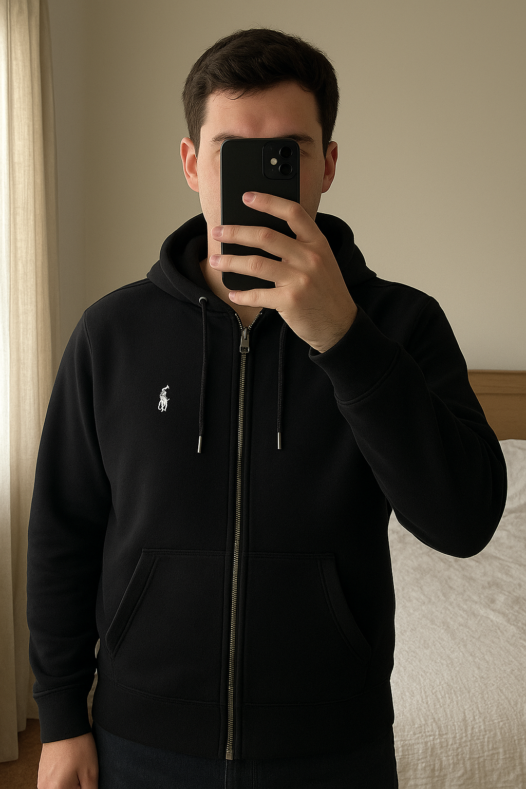 Veste Ralph Lauren debout, face à la caméra, dans une chambre à la lumière douce, avec une lumière naturelle filtrant par la fenêtre.