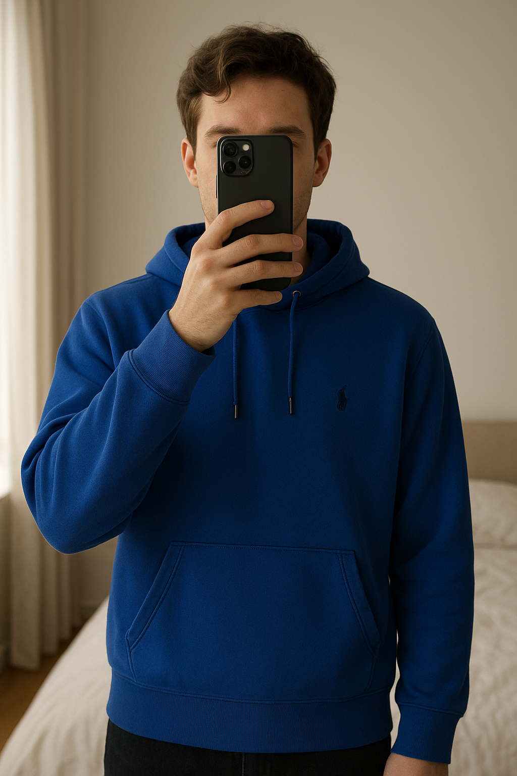 veste ralph lauren zippé debout, face à la caméra, dans une chambre à la lumière douce, avec une lumière naturelle filtrant par la fenêtre.