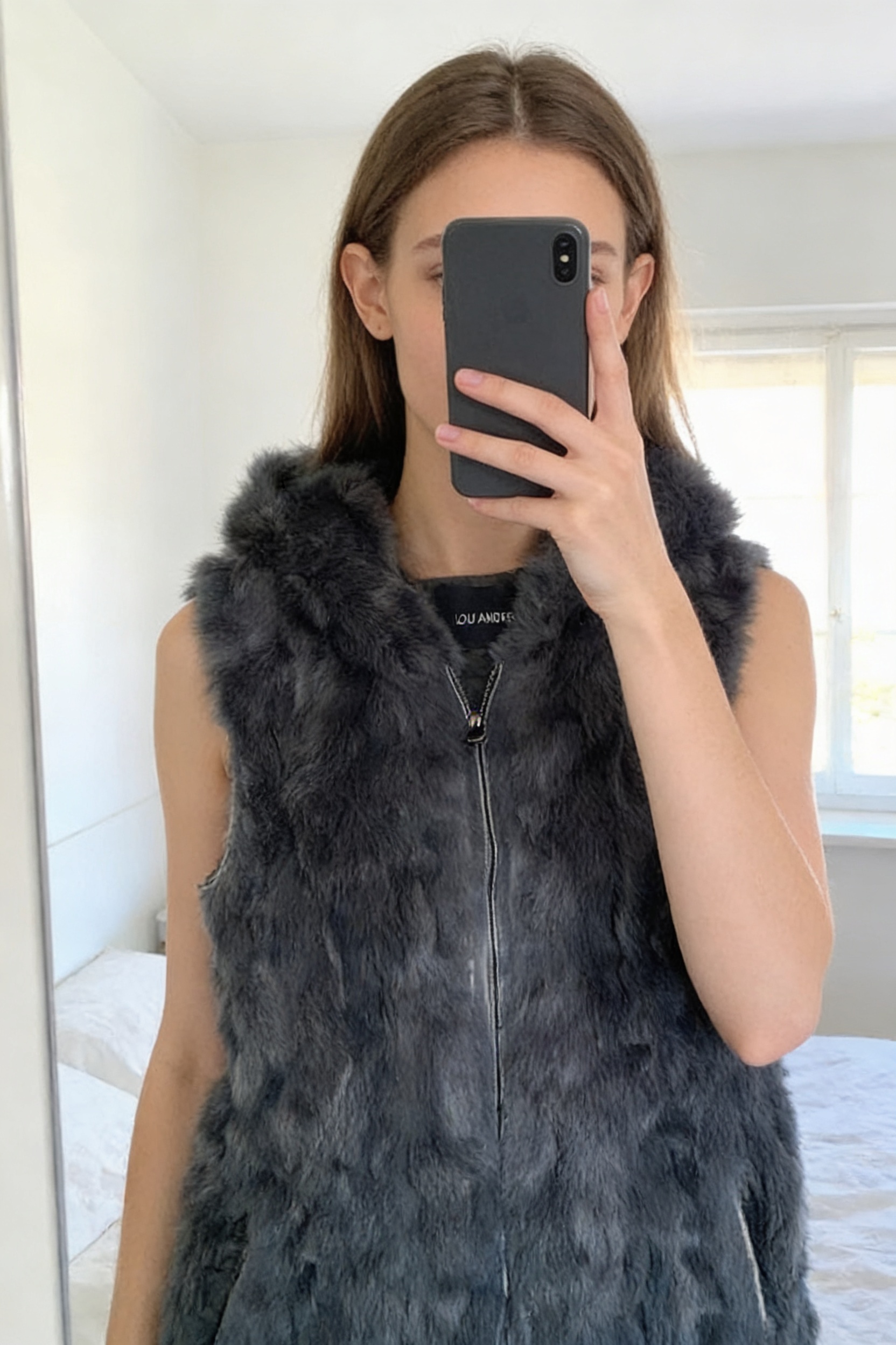 Une personne en Veste sans manches debout, face à la caméra, dans une chambre à la lumière douce, avec une lumière naturelle filtrant par la fenêtre.