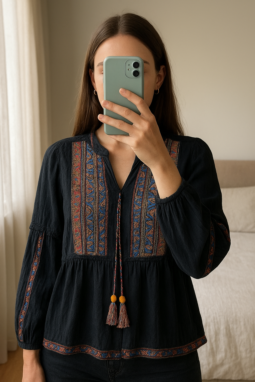 Veste style bohème Zara manches ballon debout, face à la caméra, dans une chambre à la lumière douce, avec une lumière naturelle filtrant par la fenêtre.
