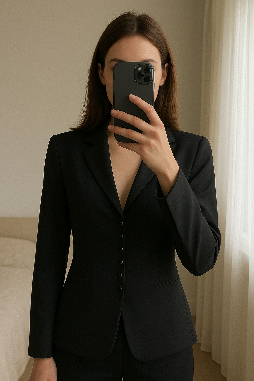 Veste T44/46 debout, face à la caméra, dans une chambre à la lumière douce, avec une lumière naturelle filtrant par la fenêtre.