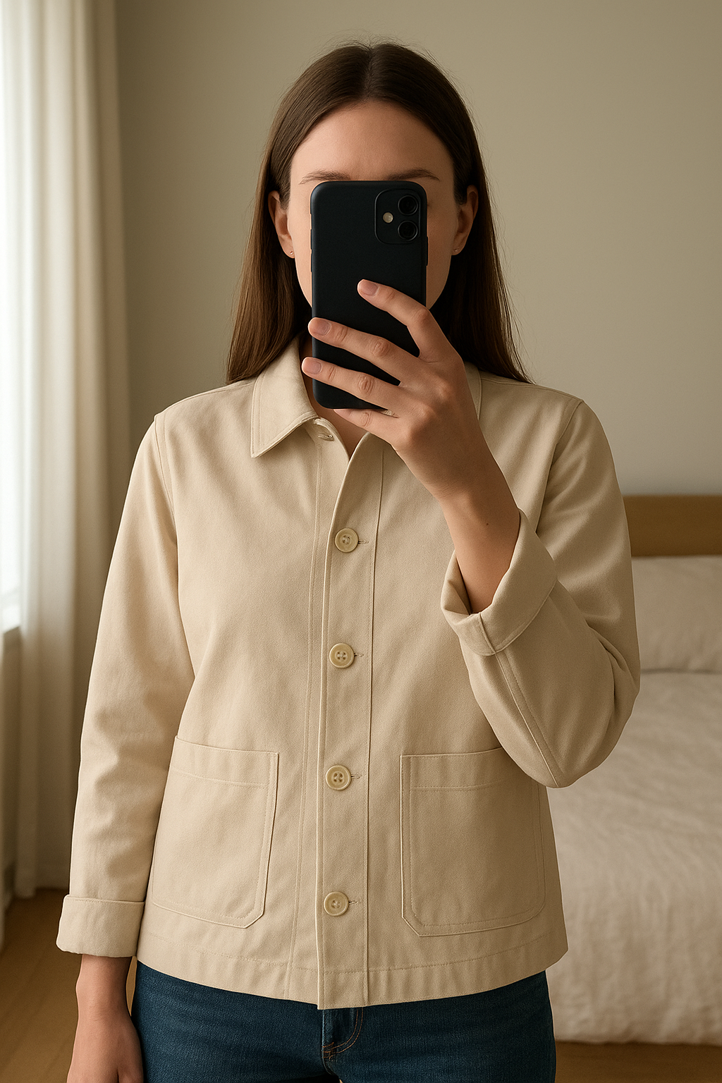 Veste Uniqlo debout, face à la caméra, dans une chambre à la lumière douce, avec une lumière naturelle filtrant par la fenêtre.