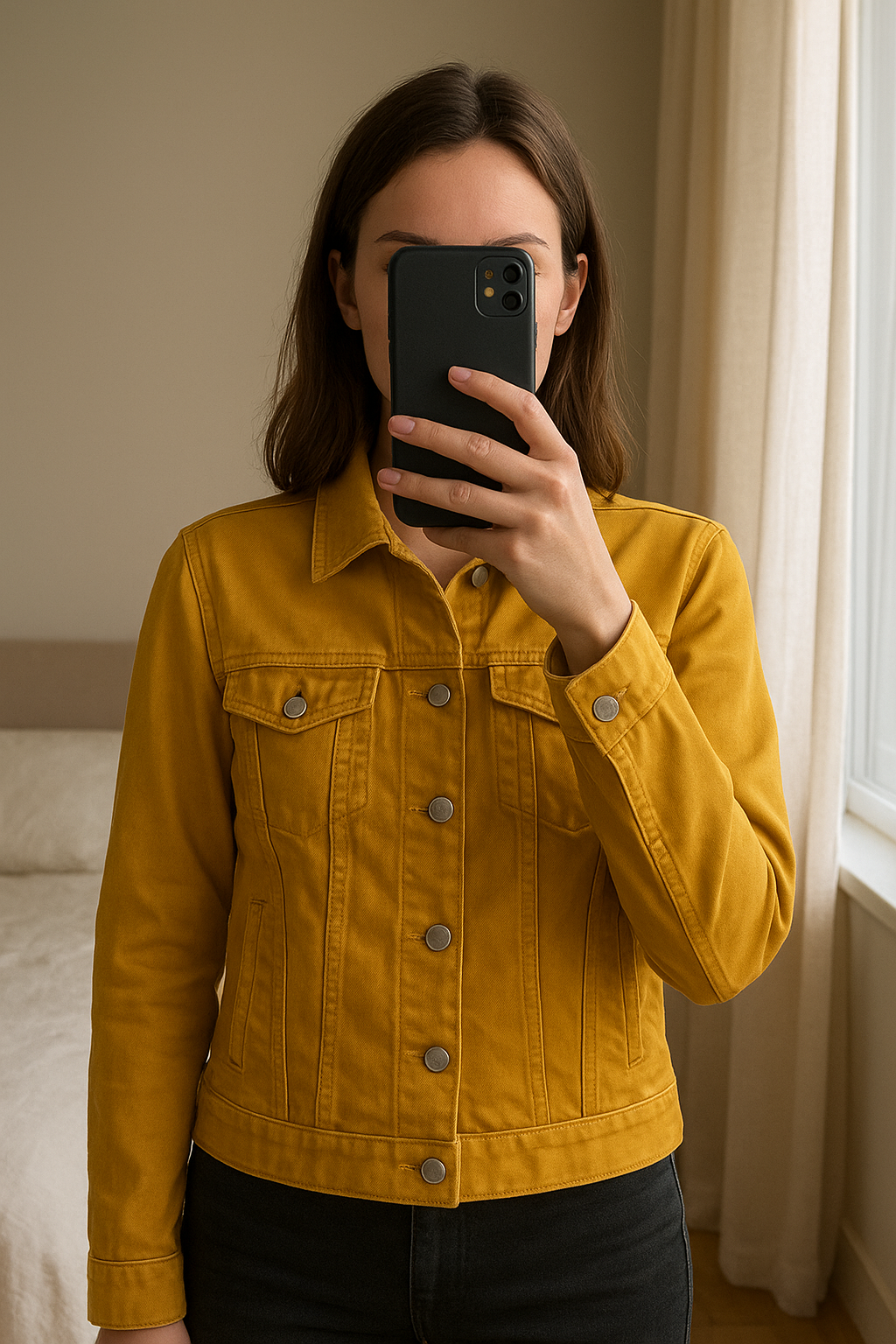 Veste Zara 100% coton - Taille L - couleur Jaune debout, face à la caméra, dans une chambre à la lumière douce, avec une lumière naturelle filtrant par la fenêtre.