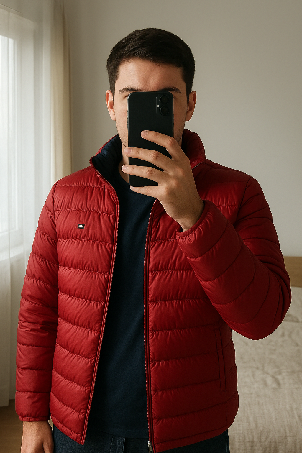 Vestes matelassés Tommy Jeans debout, face à la caméra, dans une chambre à la lumière douce, avec une lumière naturelle filtrant par la fenêtre.