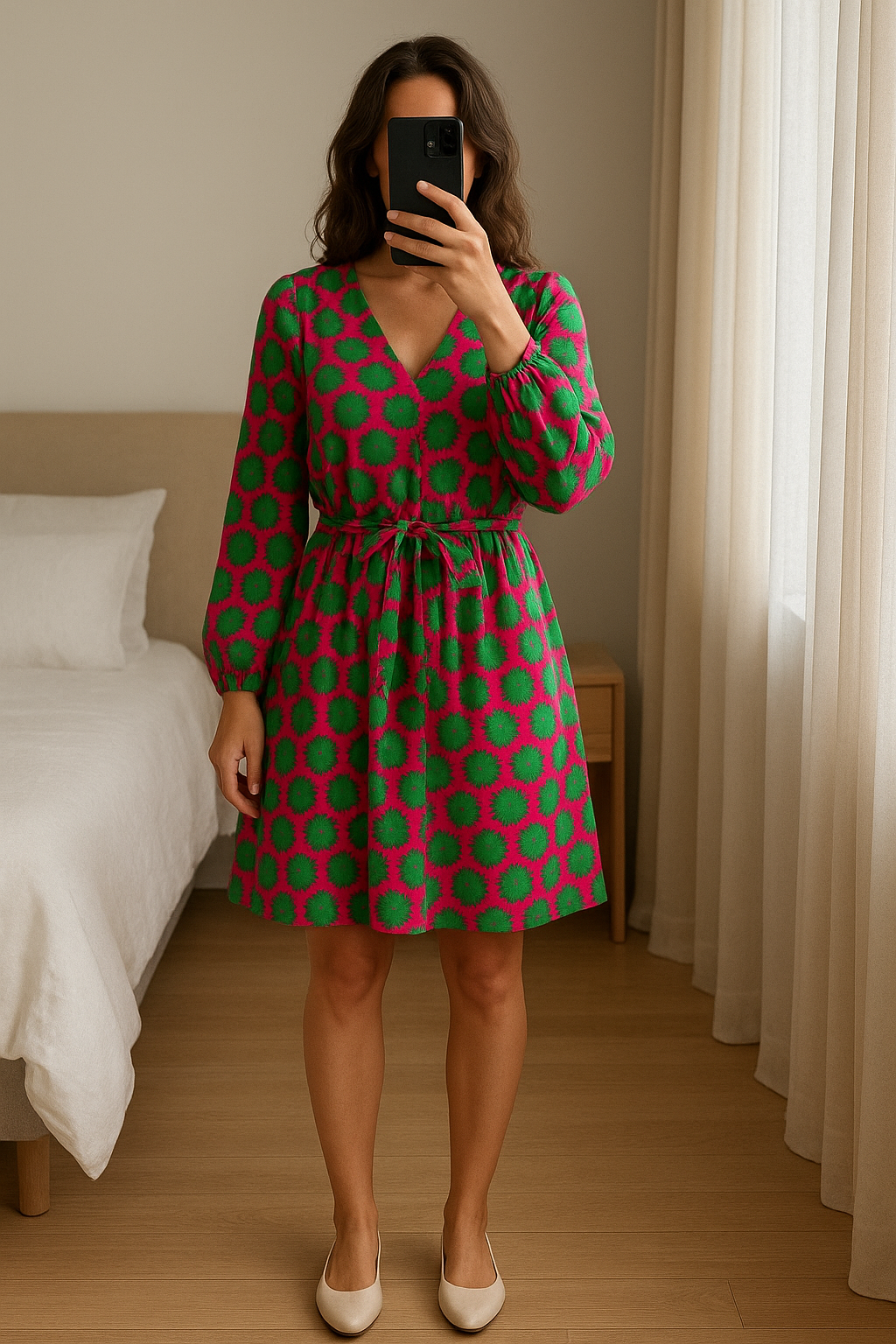 Vestido estampado de pie, mirando a la cámara, en un dormitorio con luz suave y natural filtrándose por la ventana.
