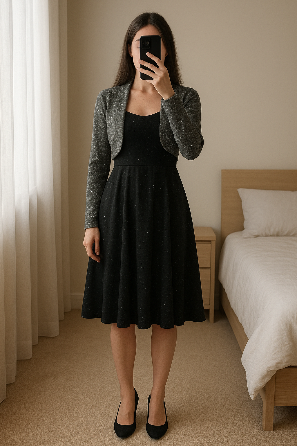 Vestitino cerimonia + giacchetto in piedi, rivolto verso la fotocamera, in una camera da letto con luce soffusa e luce naturale che filtra dalla finestra.