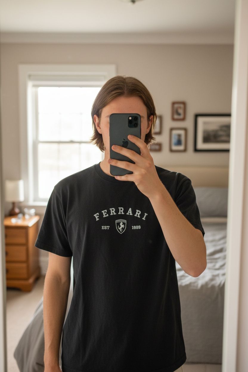 Vintage Ferrari T-Shirt aufrecht stehend, der Kamera zugewandt, in einem sanft beleuchteten Schlafzimmer, mit natürlichem Licht, das durch ein Fenster fällt.
